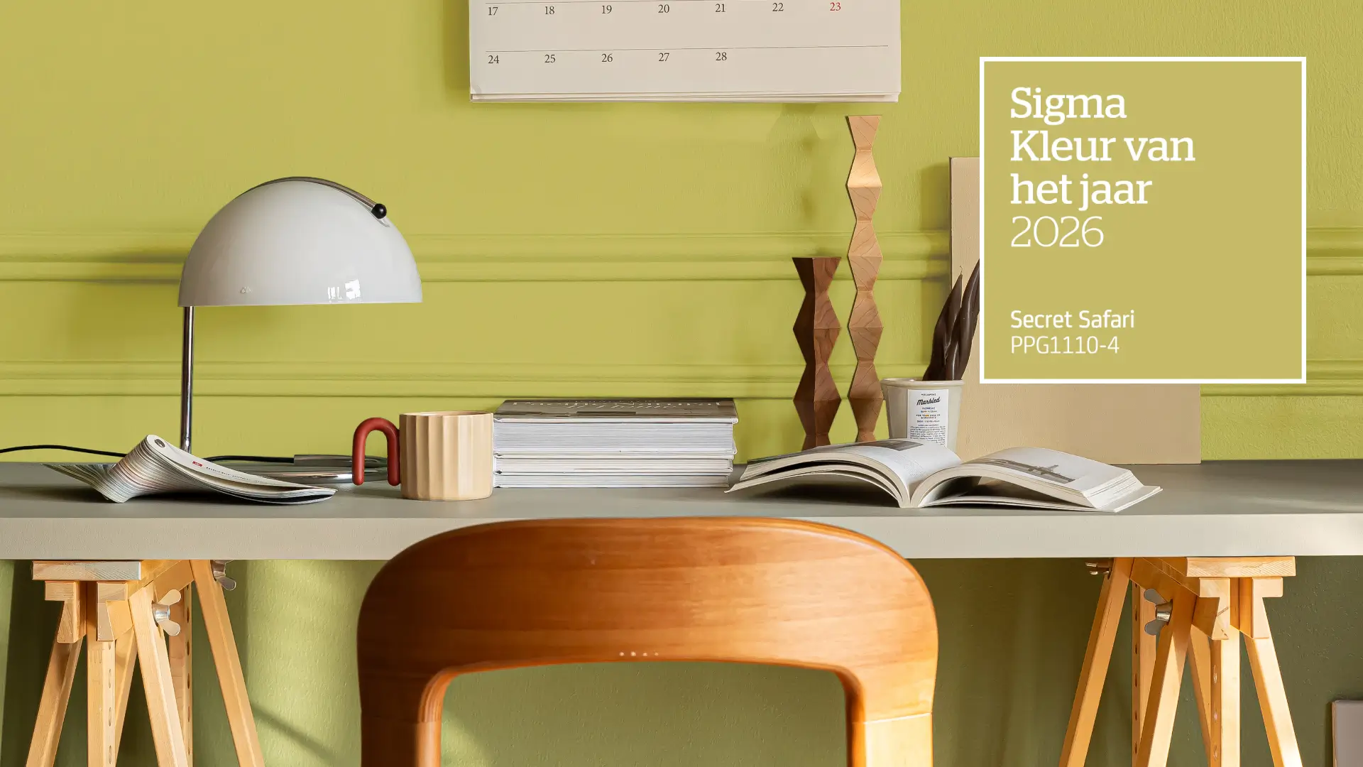 Verf in Secret Safari vertelt een natuurlijk verhaal. De Sigma kleur van het jaar 2026, een zachte, vergrijsde groentint, vormt de perfecte basis voor rust en balans. Combineer deze met zand, terracotta of diep bosgroen voor extra diepte en een warme uitstraling. Met verf van Colors@Home breng je de rust van de natuur rechtstreeks op je muren, in een look die tijdloos én trendbewust is.